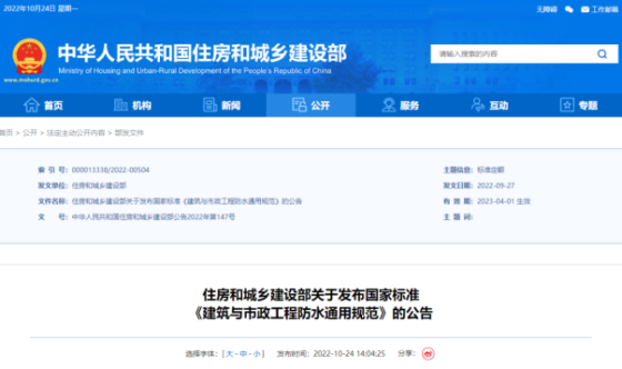 在2022年10月24日,住房和城乡建设部发布了一份公告,宣布批准《建筑与市政工程防水通用规范》(以下简称为《通用规范》)成为国家标准,标准编号为GB55030-2022。该标准将于2023年4月1日开始实施,并且它被认为是一项强制性的工程建设规范,所有相关条文必须得到严格的执行。一、《通用规范》被称为最严防水强制性规范《通用规范》明确规定了工程防水设计工作的年限、防水类别、使用环境类别和防水等级等方面的要求。该规范详细规定了防水混凝土、防水卷材、防水涂料、水泥基防水材料、防水密封材料及其他相关材料在工程应用中需要满足的